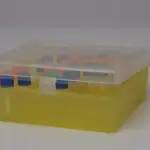 Su base de color amarillo facilita la identificación, mientras que la tapa transparente permite visualizar el contenido sin necesidad de abrir la caja. Es un accesorio esencial en laboratorios de biología molecular, microbiología y bancos de muestras.