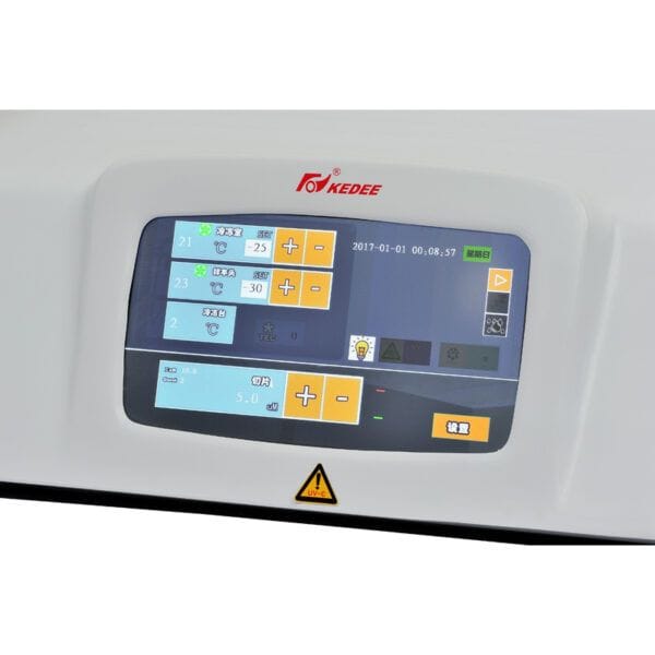 Gracias a su sistema de refrigeración dual, con compresores alemanes y refrigerante ecológico R404A, el KD‑3000 puede alcanzar temperaturas de hasta –60 °C en menos de 30 minutos. Esto asegura cortes nítidos, seguros y eficientes. Además, integra funciones de hibernación, desinfección UV y retorno automático del cabezal, convirtiéndolo en una herramienta indispensable para laboratorios modernos.